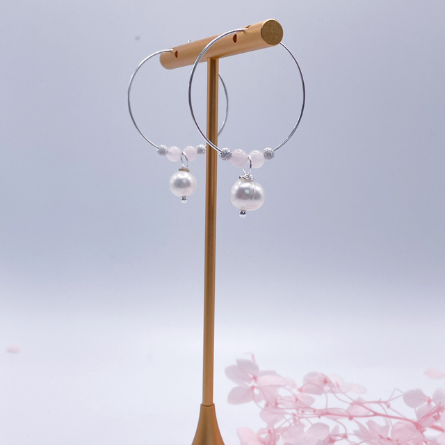 Créoles en Argent, Quartz Rose et Perles d’Eau Douce – Élégance et Douceur