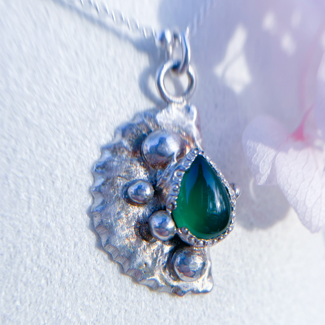 Élégant et raffiné, ce pendentif en argent 925 est façonné à la main dans mon atelier en Bretagne. Son design en demi-cercle met en valeur une magnifique goutte d’agate verte, sertie avec soin. La douceur de la pierre et l’éclat de l’argent se marient harmonieusement pour un bijou à la fois naturel et intemporel. À porter seul ou à associer à la chaîne de votre choix.